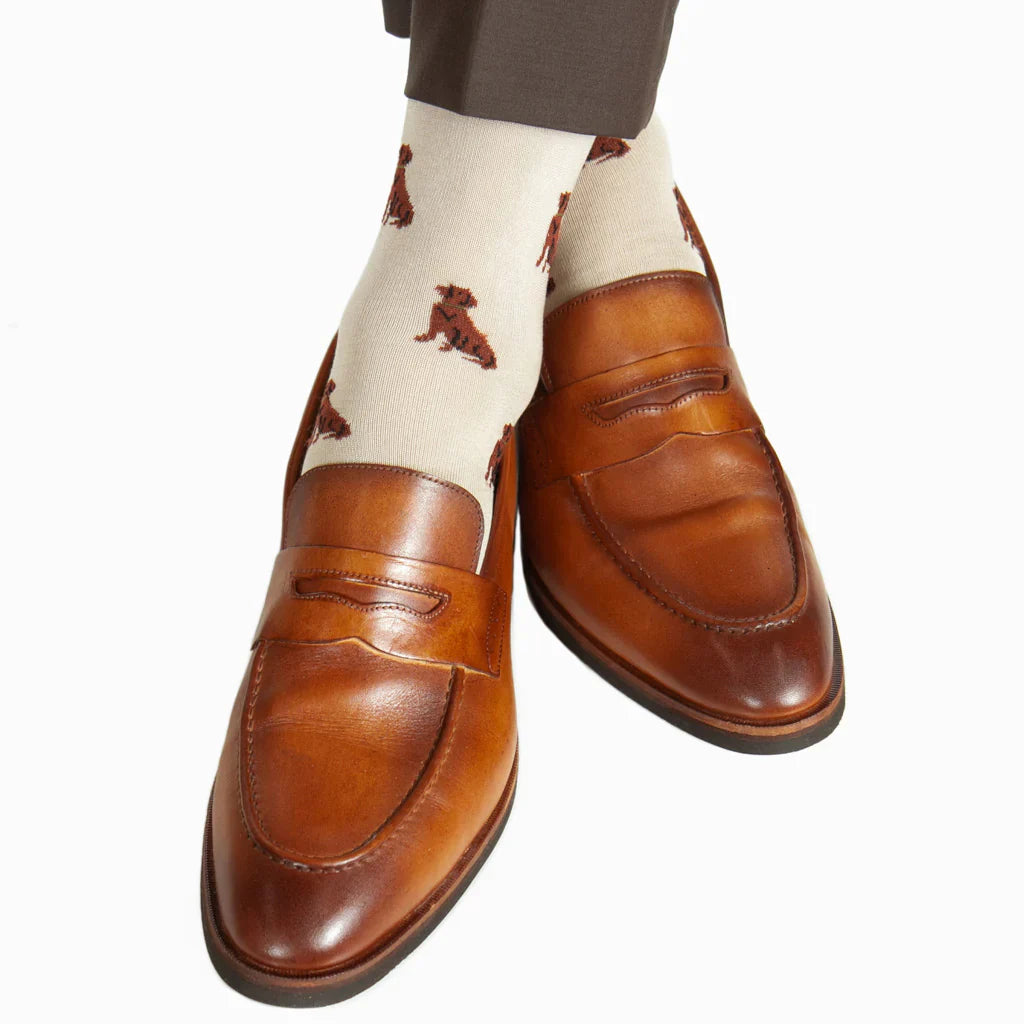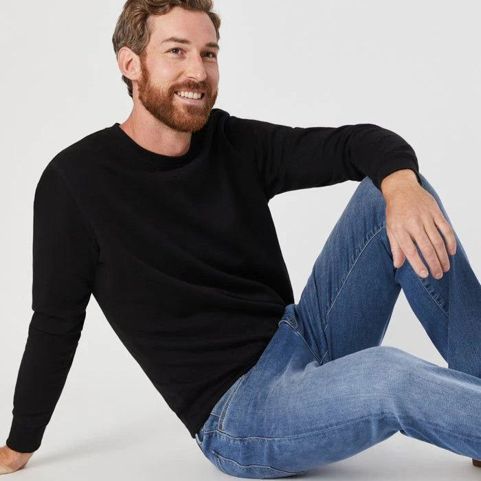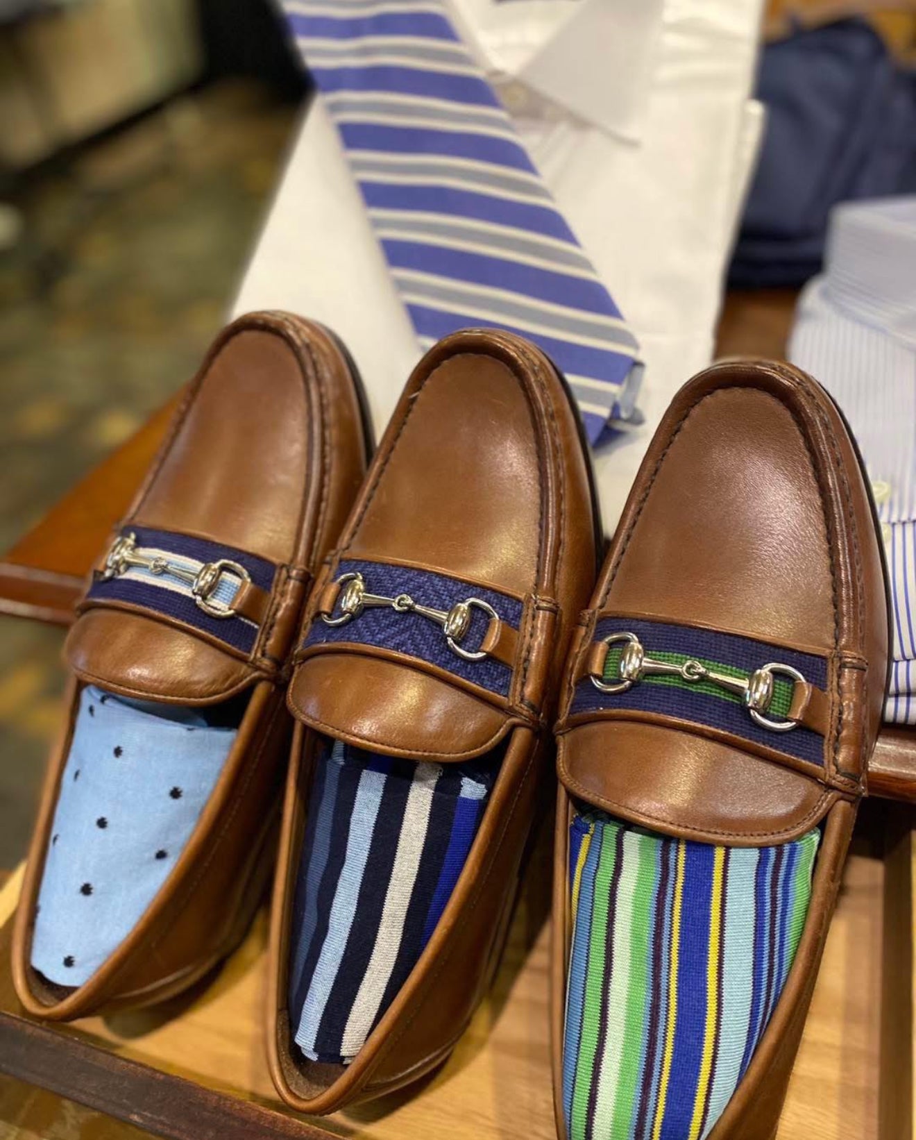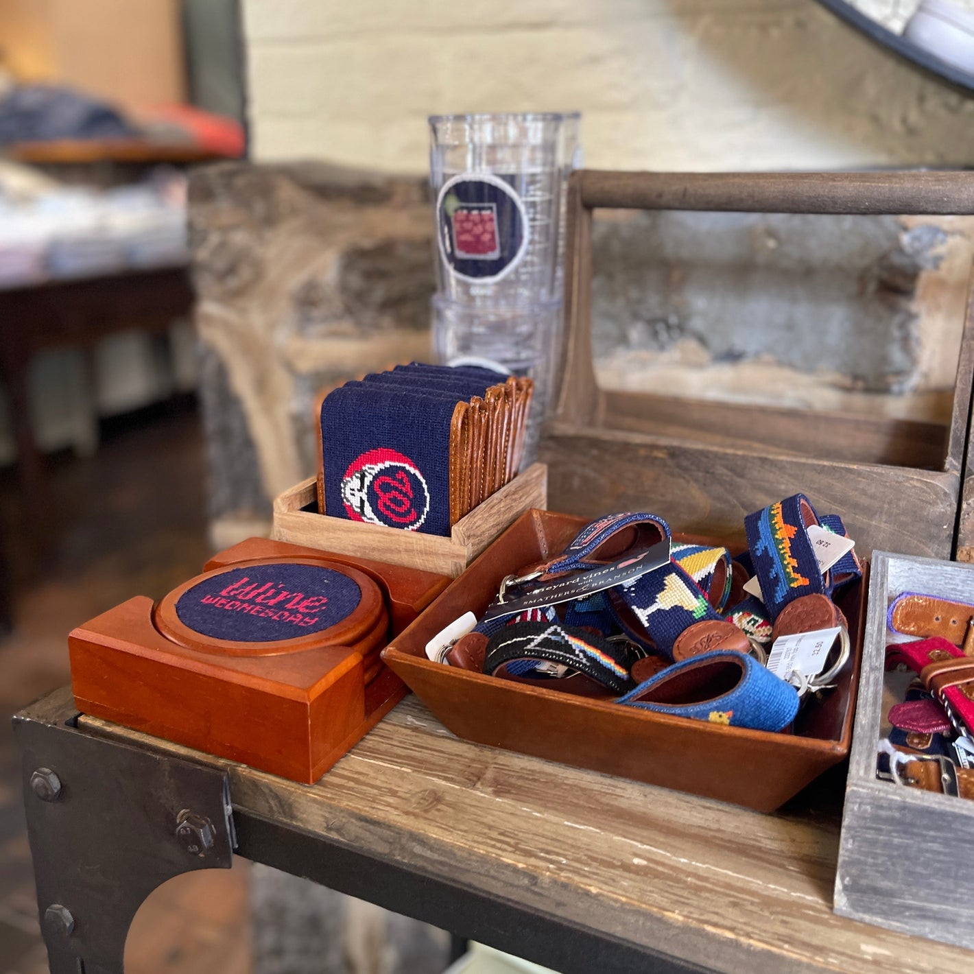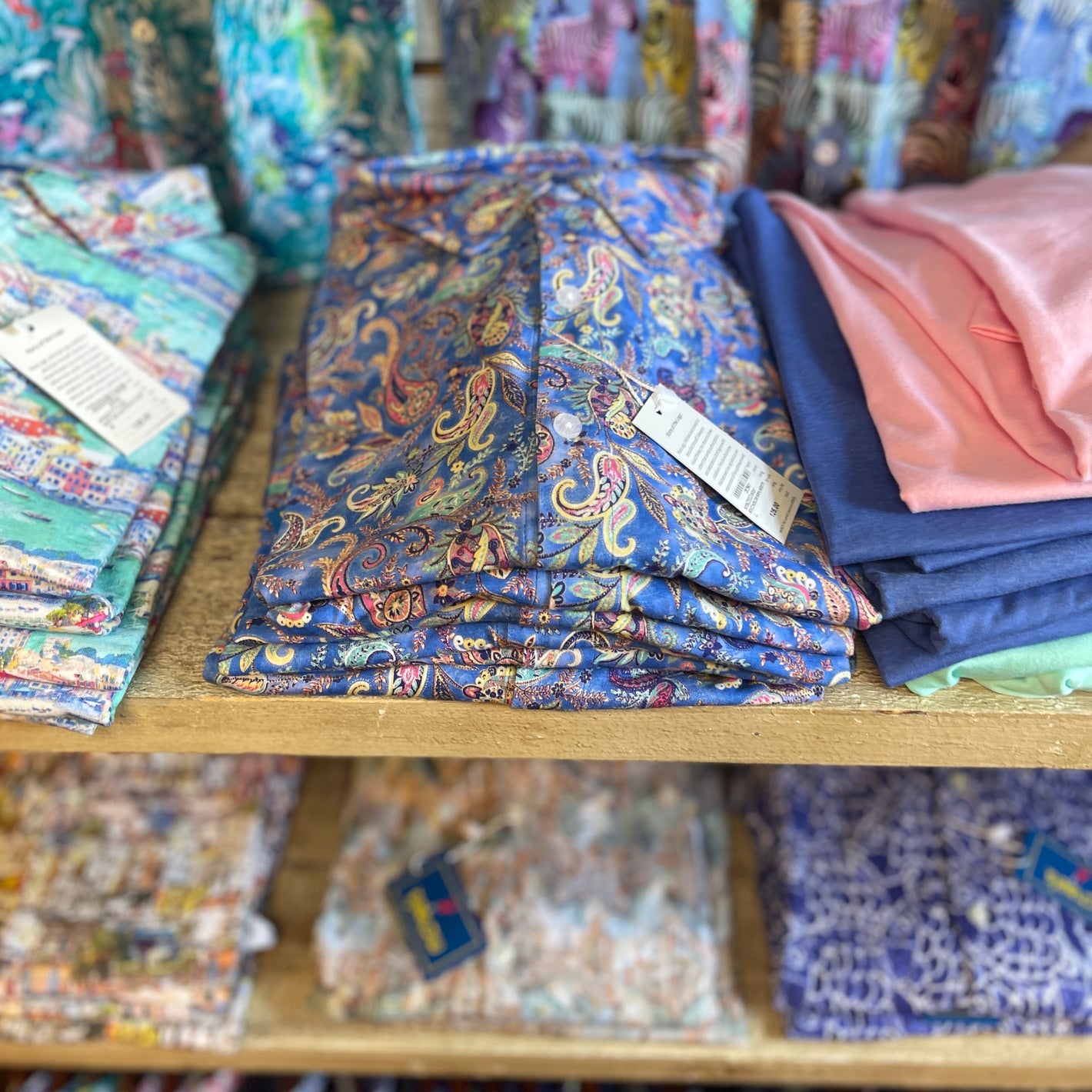 • Stack of folded brown, blue, and gray pants with a brand tag on a wooden surface.