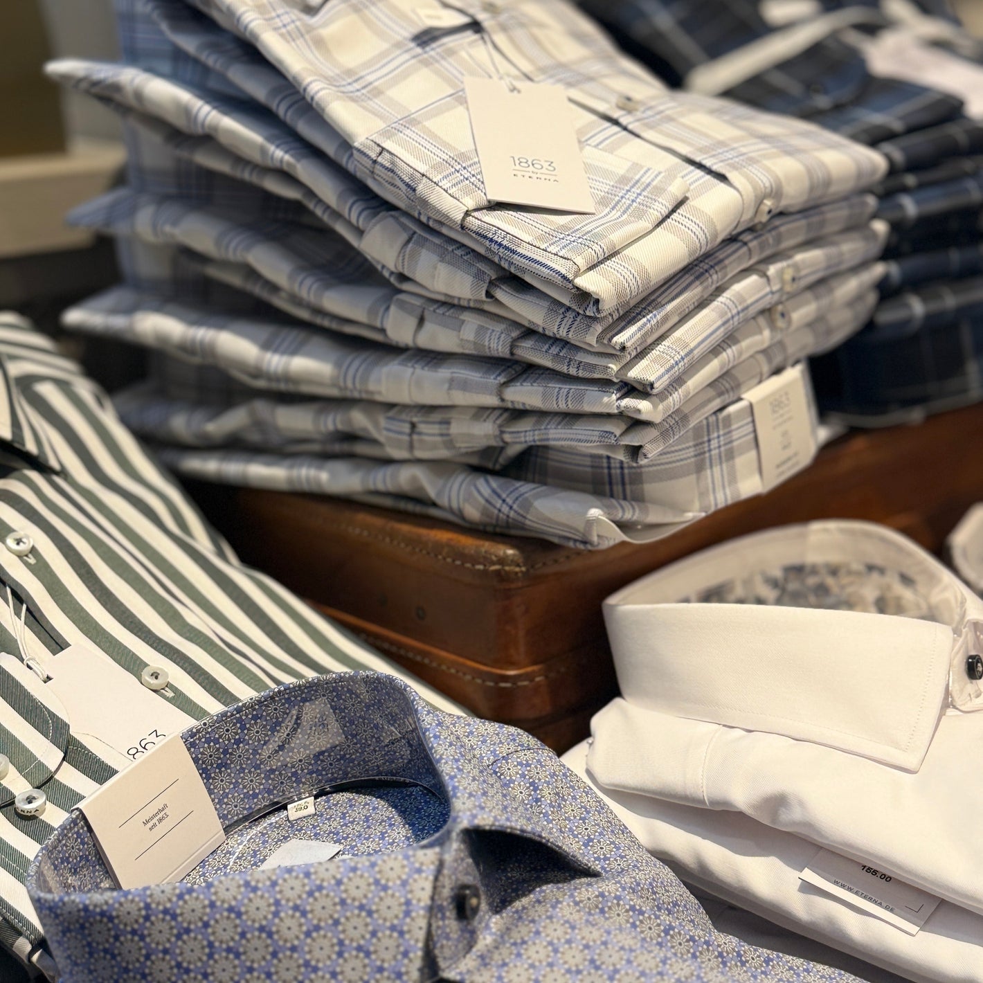 • Close-up of a plaid shirt collar with a brand label on a wooden surface